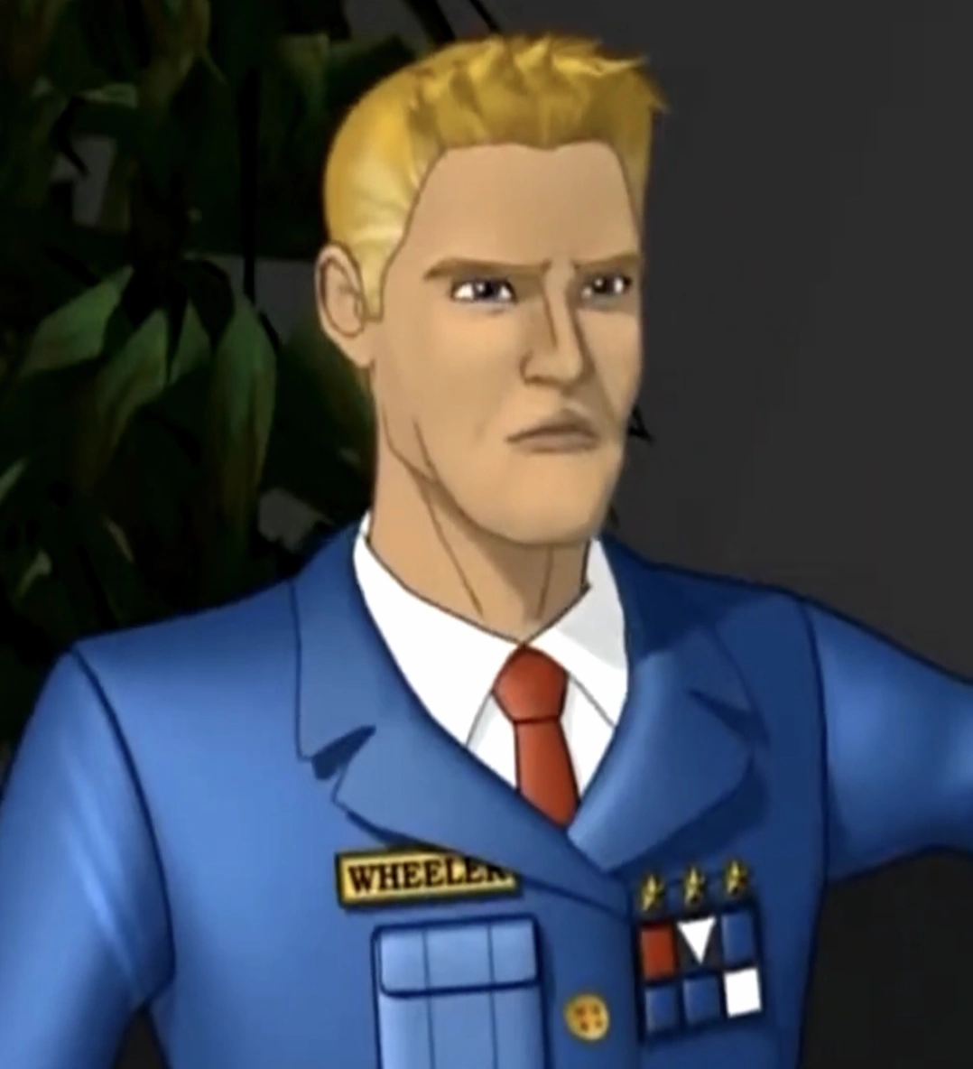 Major Wheeler is a middle-aged white man with short, blond hair having grey strands on the sides. He has blue eyes and a square jaw. He wears a blue suit and red tie that is adorned with several military medals, and a name tag titled “Wheeler”.
