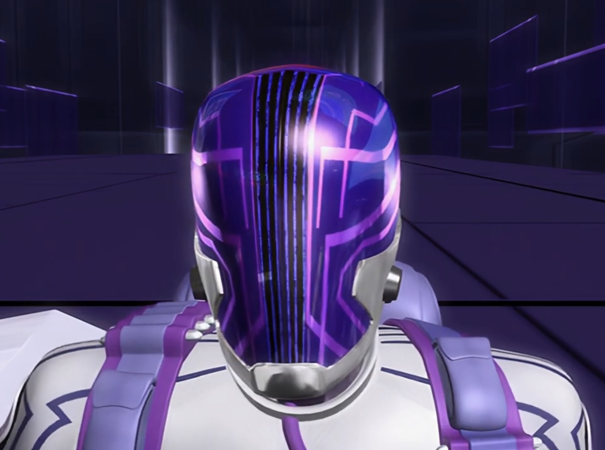 As a Silencerz member, he wears a white jumpsuit. The suit is styled with purple lining and circuitry patterns. His helmet has a silver base, and covers the face and top of the head in opaque purple glass with bright circuitry.